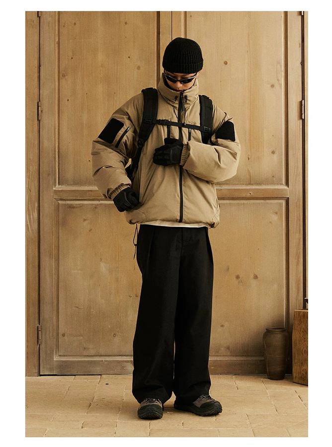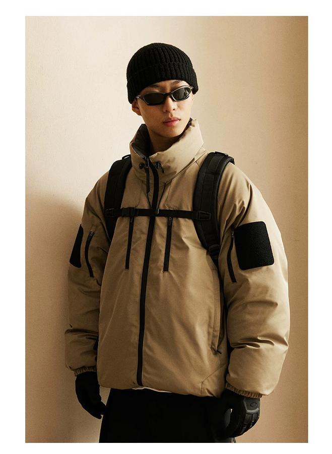 Functional windproof down jacket, loose-fitting cut, easily suitable for commuting and outdoor wear. The body of the jacket adopts a special weaving process, making the fabric dense and thick, wrinkle-resistant and comfortable. It can be worn on both sides, with a quilted design on the back, and the design is simple and versatile. The inner filling is 90% high-quality white duck down, which is soft and fluffy, and has excellent warmth and heat insulation performance